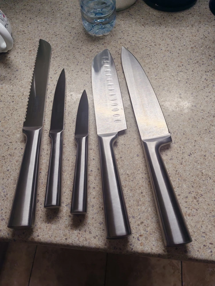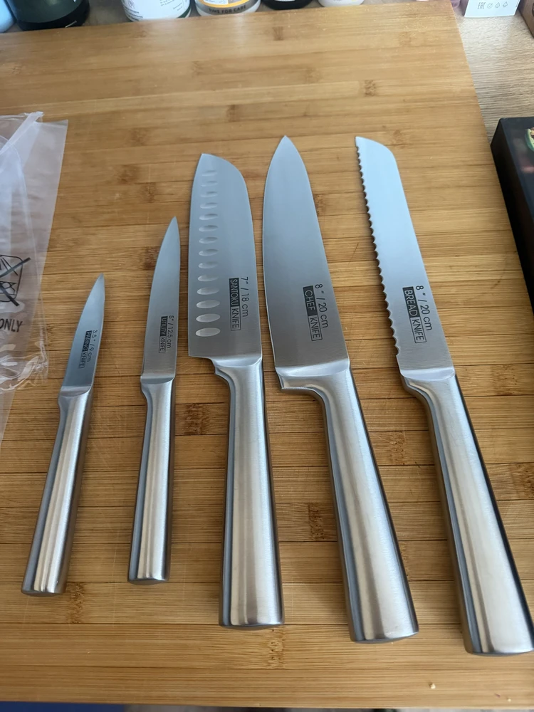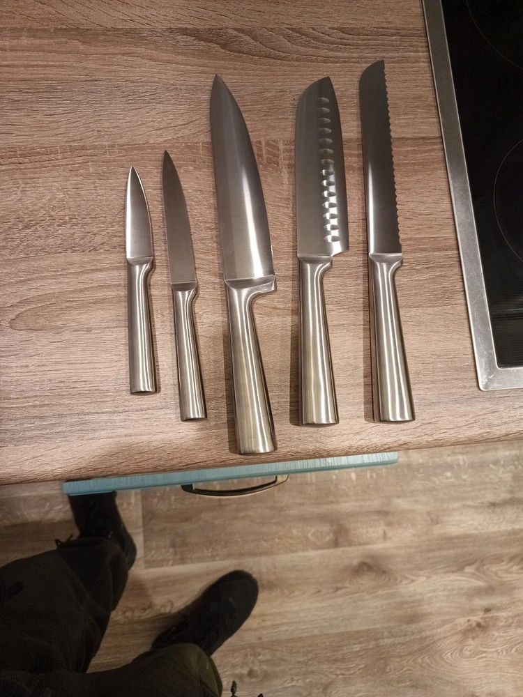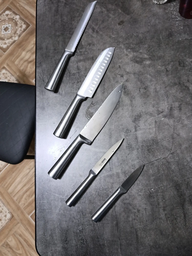 В комплект 5 ножей для нарезки овощей, фруктов, мяса, рыбы, хлеба и других продуктов.